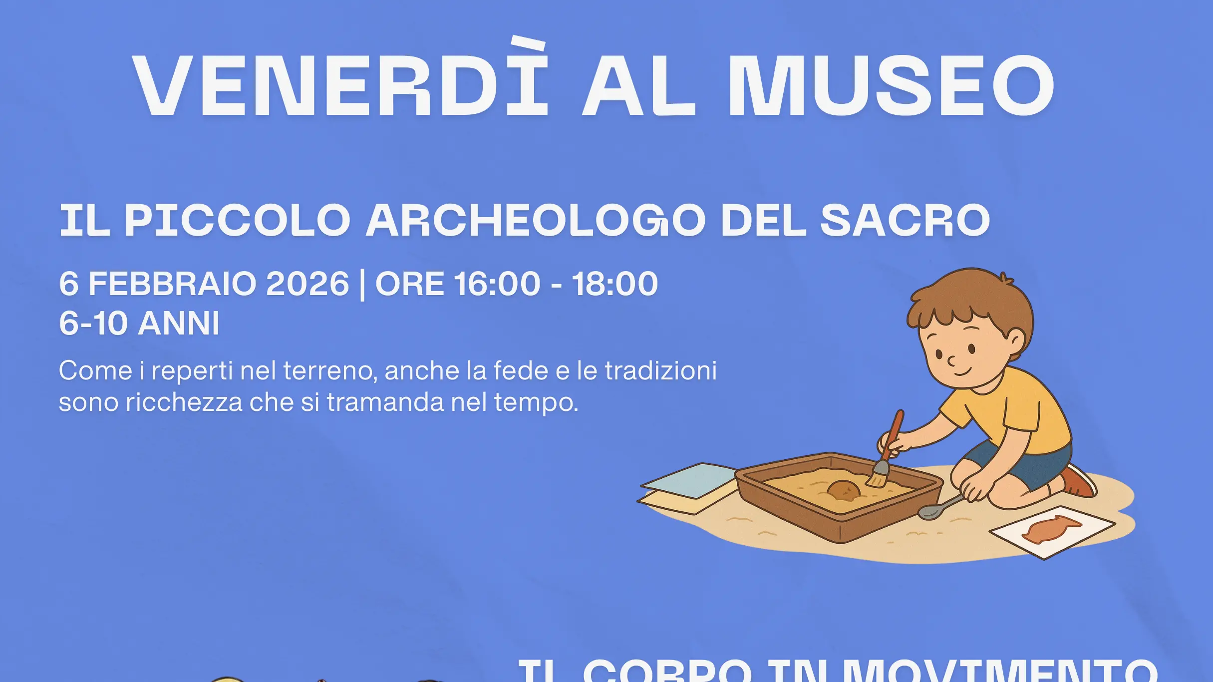 Venerdì 6 febbraio h 16-18 l’attività “Il piccolo archeologo del sacro” introdurrà i bambini dai 6 ai 10 anni al metodo archeologico, usando l'idea della stratificazione per esplorare la storia. Simuleranno uno scavo, riportando alla luce alcuni reperti nascosti e annotando ogni ritrovamento su una scheda di scavo. Completato lo scavo, analizzeranno e confronteranno i reperti, ipotizzandone funzione ed epoca. Creeranno, quindi, ciascuno il proprio reperto, con materiali di riciclo, immaginandone una funzione, un’epoca e una storia da tramandare.