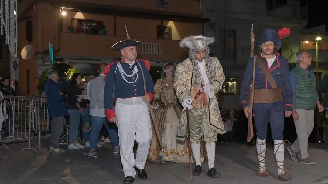 Successivamente un corteo di personaggi in costumi d’epoca si snoderà lungo le vie più antiche di Mosorrofa inscenando una processione di ringraziamento in onore del santo. Quasi un centinaio di comparse, introdotte da suonatori di tamburi e guidate dal governatore dell’antica e gloriosa città di S. Agata, di cui Mosorrofa era casale, sfileranno per le strade. Vedremo le autorità accompagnate e protette dalle milizie settecentesche, i sindaci locali, il vescovo, i prelati membri della Comunia S. Agatina, e la confraternita settecentesca di S. Demetrio cui è demandato il compito di trasportare la vara del santo, ricostruita per l’occasione. Seguiranno le famiglie dei Melacrino, dei Sarlo, dei Borruto e dei Federico, nobili di Sant’Agata nei loro sfarzosi vestiti e con tanto di stendardi del casato di appartenenza. E poi la parte più genuinamente popolare rappresentata dalla gente comune che accompagnerà la vara in processione a testimonianza di una fede sentita, viva e scandita dal lento pianto delle “pie donne” segno di un trasporto particolare per il martirio del santo.