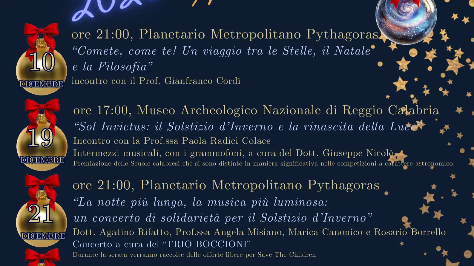 Cuore del programma è la celebrazione del Solstizio d'Inverno, il 19 dicembre alle ore 17:00, presso il Museo Archeologico Nazionale di Reggio Calabria, con l'incontro "Sol Invictus: il Solstizio d'Inverno e la rinascita della Luce" della Professoressa Paola Radici Colace, arricchito da intermezzi musicali a cura del Dottor Giuseppe Nicolò, e con la premiazione delle Scuole calabresi distintesi in competizioni astronomiche.