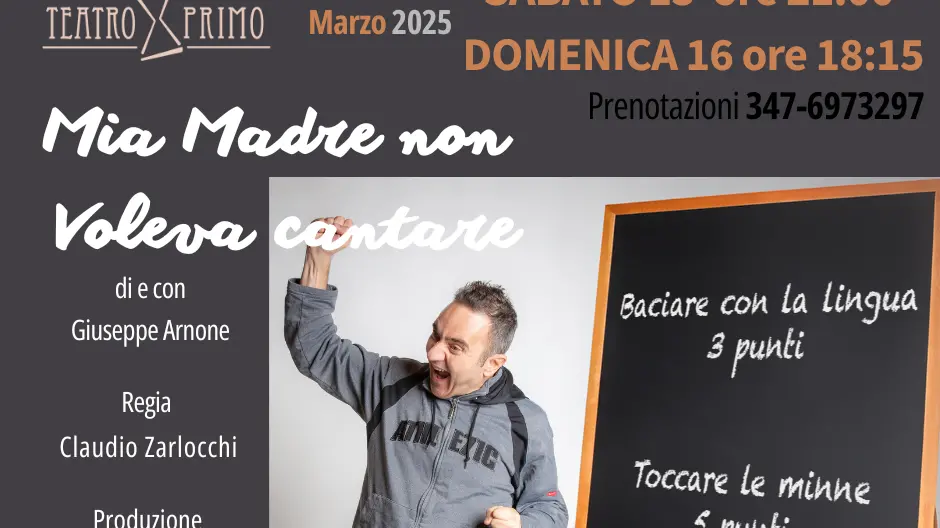 Lo spettacolo “Mia madre non voleva cantare” (Produzione Multietra Spettacoli e Intrattenimento), di e con Giuseppe Arnone e la regia Claudio Zarlocchi, che andrà in scena sabato 15 marzo alle 21.00 e domenica 16 marzo alle 18.15.