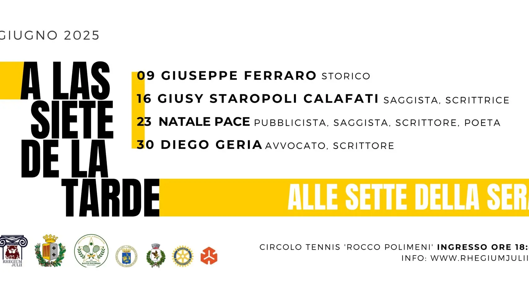 Il ciclo d’incontri che avranno inizio nel mese di giugno si avvarranno di un ricco calendario denominato “A LAS SIETE DE LA TARDE”, alle sette della sera , che si terranno tutti i lunedì del mese, presso il Circolo tennis “Rocco Polimeni”.