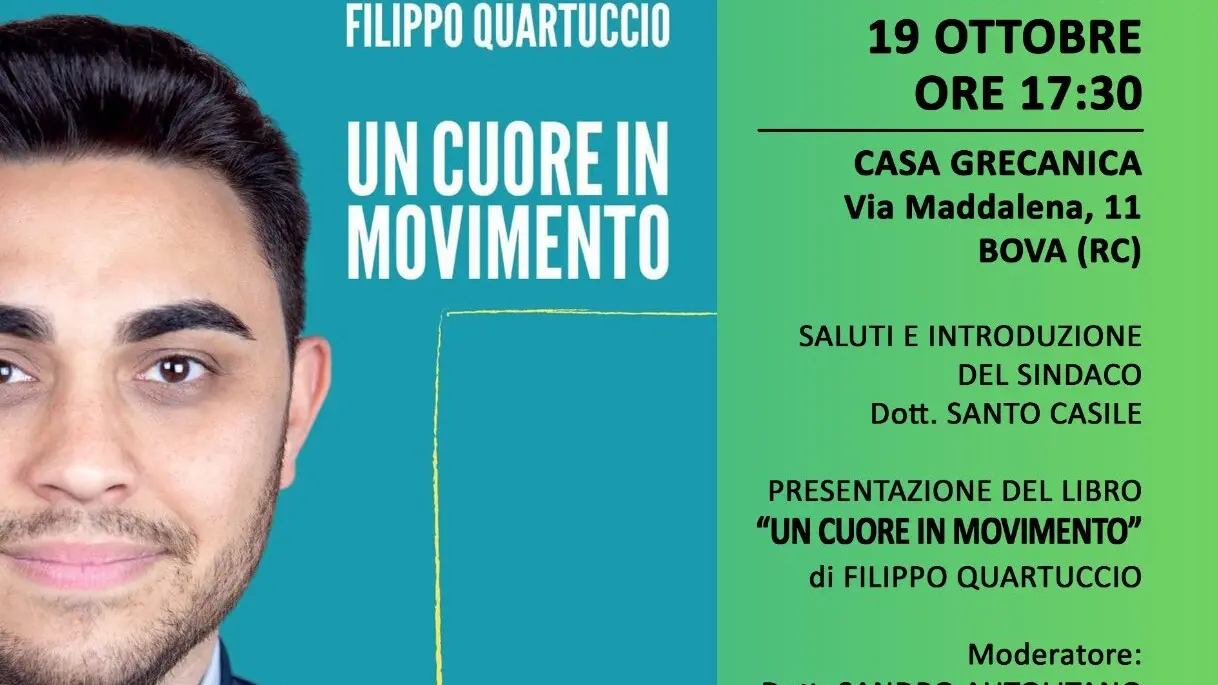 Sabato 19 ottobre 2024 alle ore 17:30, presso la Casa Grecanica di Bova (RC), si terrà la presentazione del libro “Un cuore in movimento” di Filippo Quartuccio. L’evento vedrà i saluti e l’introduzione del sindaco di Bova, Santo Casile, con la moderazione del dott. Sandro Autolitano. Il libro, pubblicato da Redaction Editrice, racconta una storia emozionante e sentita, offrendo una testimonianza personale che vuole essere di stimolo per quanti desiderano impegnarsi concretamente per il bene comune. Filippo Quartuccio, consigliere comunale e metropolitano reggino, è delegato alla Cultura della Città Metropolitana di Reggio Calabria.