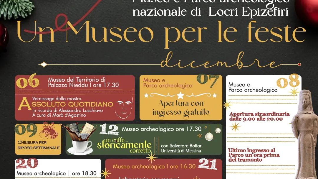 Anche per tutto dicembre e per il periodo festivo il Museo e Parco archeologico nazionale di Locri Epizefiri offrirà ai visitatori un calendario ricco di appuntamenti che contribuiranno ad animare il momento più suggestivo dell’anno con aperture straordinarie, mostre e i consueti laboratori che nascono da preziose collaborazioni con la comunità, le associazioni del territorio e le amministrazioni comunali.