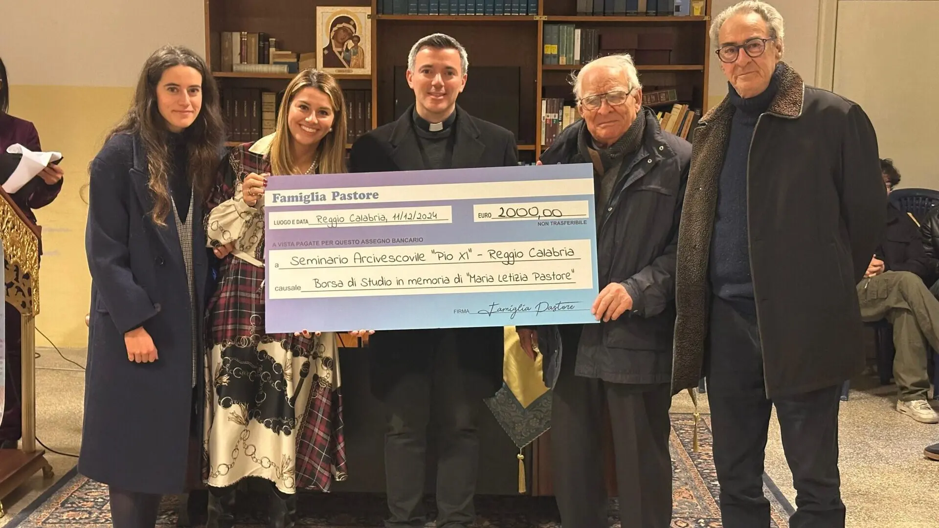 L’incontro si è aperto con un momento significativo: la famiglia Sotira Pastore ha consegnato al Rettore, Don Simone Gatto, un maxi assegno simbolico a sostegno della borsa di studio intitolata alla professoressa Maria Letizia Pastore, recentemente scomparsa. La borsa di studio è destinata a sostenere il percorso formativo di un seminarista, confermando l’impegno della comunità a favore dell’educazione e della crescita spirituale.