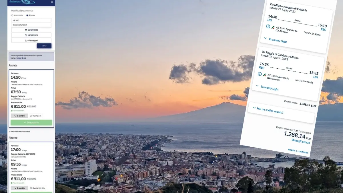 Facciamo un esempio concreto. Marito e moglie reggini che lavorano a Milano scoprono solo oggi che potranno andare in ferie dal 29 luglio al 14 agosto. Marito e moglie, quindi, si precipitano a prenotare il viaggio di andata e ritorno per sé e per i propri figli di 6 e 8 anni. Il costo con ITA Airways con solo bagaglio a mano di 8 kg è pari a 1288 euro andata e ritorno. Circa 100 euro in più per aggiungere un bagaglio in stiva. 300 euro in meno, a pari condizioni, se con ITA si arriva e riparte da Lamezia Terme. Ma lo scalo lametino ha anche altri vettori, e con una spesa totale di 950 euro circa si può arrivare e tornare alle stesse condizioni.