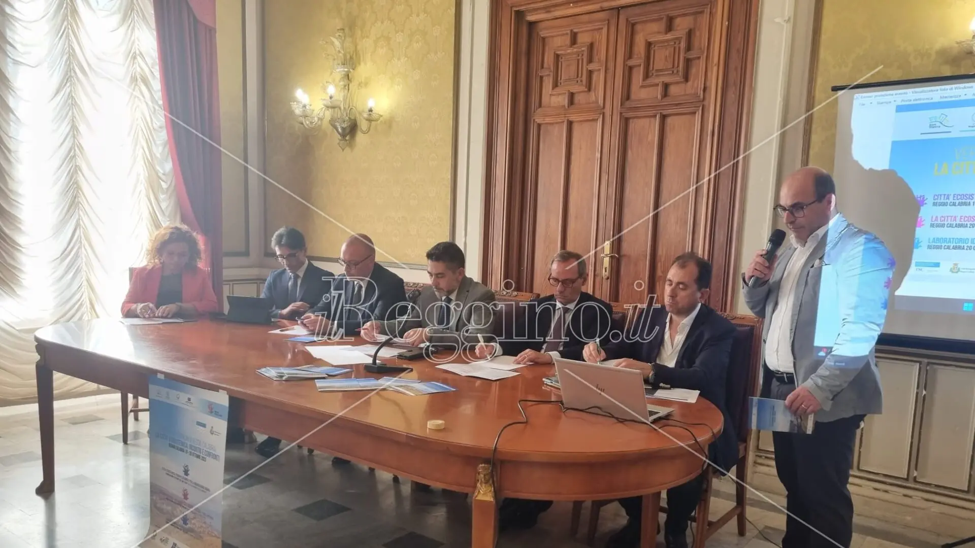 Oggi pomeriggio il salone dei Lampadari di palazzo San Giorgio ha ospitato i lavori di apertura del “Masterplan di Reggio”, una nuova visione metropolitana concordata e coordinata sotto il faro della città ecosistemica. Ad introdurre i sindaci facenti funzioni Paolo Brunetti e Carmelo Versace, l’assessore Giuggi Palmenta, il consigliere delegato Massimo Merenda, il consigliere Giuseppe Giordano.
