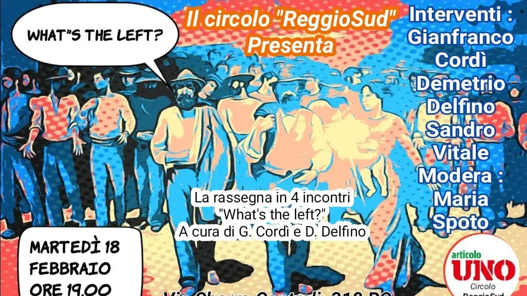 A Torino il 3 e il 4 dicembre del 1992, organizzato dalla Fondazione “Carlo Rosselli”, si è svolto il convegno internazionale “What’s left?”. Sulla base di quella esperienza si sono succeduti, fino ad oggi, migliaia di articoli, saggi, incontri, conferenze attorno a questo tema. Demetrio Delfino (per la parte politica) e Gianfranco Cordì (per la parte filosofica) propongono oggi a 28 anni di distanza da quel convegno un’intera rassegna che porta come titolo “What’s left?”. Dopo il primo incontro di martedì 18 febbraio, ogni martedì alle ore 19, verrano presentati rispettivamente i convegni: “Destra e sinistra”, “Che cosa vuol dire essere di sinistra?” e infine “La sinistra di fronte alla globalizzazione”.