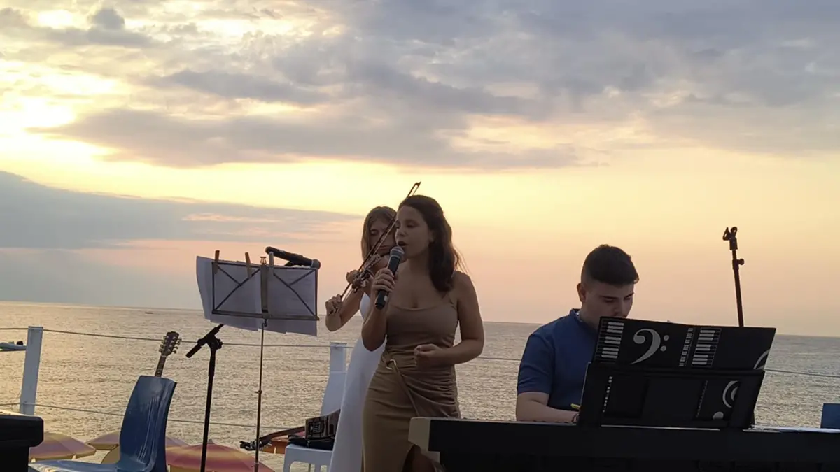 Il timido soleall’orizzonte, ha fatto da scenografia naturale a un’esperienza che ha unito armonie musicali e bellezza paesaggistica. Le note si sono diffuse leggere tra le onde, mentre il cielo si tingeva di rosa e oro. L’evento ha visto la partecipazione di Gianni Favasuli (Musica e poesia), Giovanni Misiano (in arte MisMoi), Maria Sculli (Pianoforte), Maria Pia Gullace (voce) Elena Nicoletta (violino) e Roberto Secondini (piano), Vincenzo Bova (Bouzouki e Voce), Giovanni Piemonte (Chitarra e Voce), Claudia Iriti (Voce) e Roberto Biagiotti (chitarra) regalando un repertorio raffinato che ha spaziato tra brani classici della tradizione Calabrese, Pop, Rock e composizioni originali. Ogni esecuzione è stata accolta da un silenzio rispettoso e da applausi sinceri, in un contesto che ha reso la musica protagonista assoluta. Il tutto accompagnato con la poesia della giovane autrice Silvia Rago che ha interpretato versi poetici contenuti all’interno della sua prima pubblicazione “Silenzi Svelati” ispirati alla Calabria e all’area grecanica in particolare. A conclusione si è anche unito al gruppo di artisti Tommaso Trunfio, giovane musicista folk del luogo che insieme al Maestro Gianni Favasuli e Claudia Iiriti hanno suonato una ballata di tarantella tradizionale facendo ballare tutto il pubblico presente.