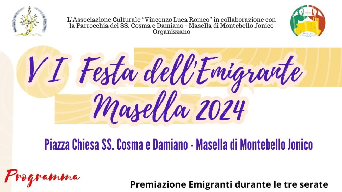 Anche quest’anno con grande gioia e soddisfazione l’Associazione Culturale “Vince.Ro”, in collaborazione con la Parrocchia “Santi Cosma e Damiano di Masella”, ha organizzato la VI edizione della “Festa dell’Emigrante” che si terrà nei giorni 2, 3 e 4 agosto presso la piazza della Chiesa di Masella. È stato pensato un programma in grado di coinvolgere tutti, in primis bambini e ragazzi nella prima serata; non poteva mancare l’attenzione alla poesia e alla cultura, prevista per la seconda serata; in ultimo, a conclusione dei tre giorni di festa, subito dopo la Santa messa dedicata agli emigranti, seguirà lo spettacolo dei Giganti di Taurianova e quello musicale di Michele Pecora.