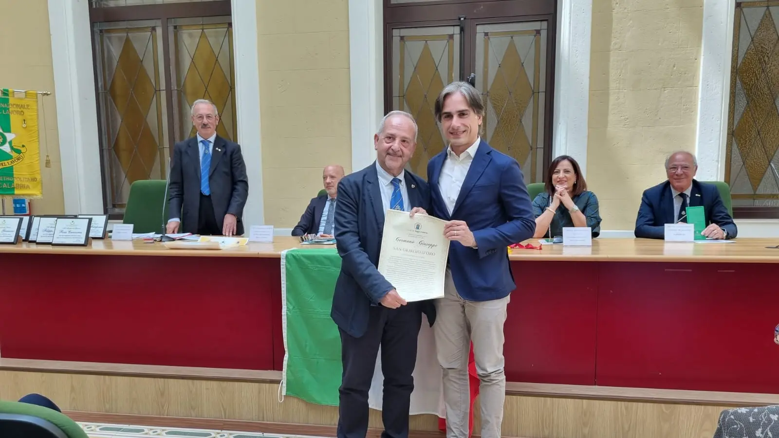 Nella sala Perri di palazzo Alvaro si è svolta la cerimonia celebrativa dei nuovi Maestri del Lavoro reggini. Nel corso dell’evento, presentato dal Console metropolitano dei Maestri del Lavoro Nicola Morabito, il Sindaco di Reggio Calabria, Giuseppe Falcomatà, ha consegnato il San Giorgio D’Oro al Maestro del Lavoro Giuseppe Germanò. Presente anche l’assessore comunale all’Istruzione Anna Briante, per la platea dei giovani studenti degli istituti Montebello Jonico-Motta San Giovanni, Panella Vallauri di Reggio Calabria, Ipsia di Siderno-Locri con i rispettivi dirigenti professori Margherita Sergi, Teresa Marino e Gaetano Pedullà e una delegazione dell’Itt Panella-Vallauri.
