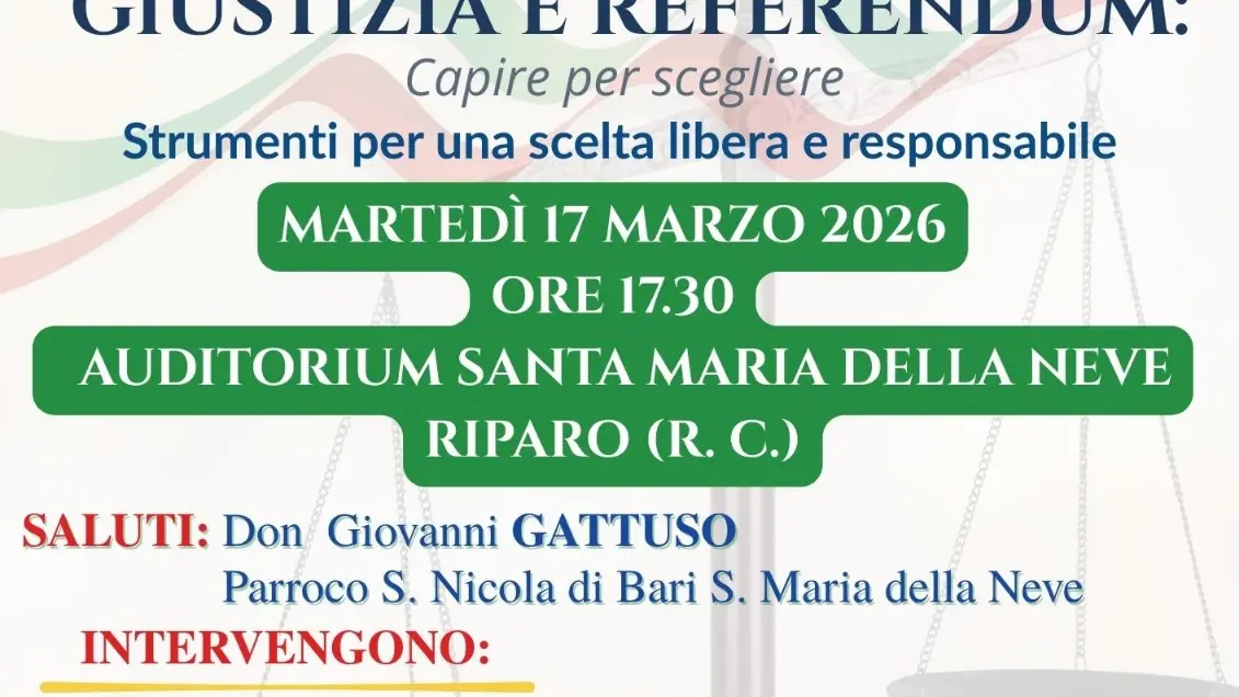 Si terrà martedì 17 marzo alle ore 17.30, presso l’Auditorium Santa Maria della Neve di Riparo Cannavò (Reggio Calabria), l’incontro–dibattito dal titolo «Giustizia e referendum: capire per scegliere. Strumenti per una scelta libera e responsabile».