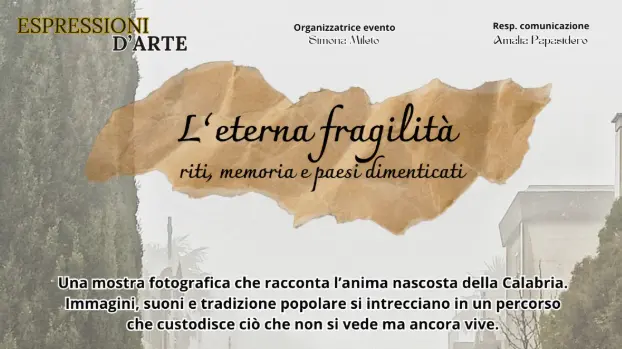 L’associazione Arte che Parla APS, in collaborazione con Persefone & Co APS, Joka Calabria APS, San Giorgio Soccorso, e con il patrocinio del Comune di San Giorgio Morgeto, presenta “L’eterna fragilità”: un progetto fotografico che esplora l’anima nascosta della Calabria, tra memoria, riti antichi e luoghi dimenticati. Tale evento nasce all’interno di Espressioni d’Arte, il percorso promosso da Arte che Parla APS per valorizzare artisti e luoghi dell’anima, allo scopo di coinvolgere il territorio, le scuole, le associazioni e la cittadinanza in un viaggio artistico e di riscoperta della tradizioni.