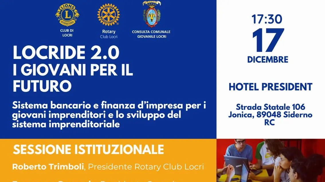 Giovani e sviluppo imprenditoriale, questo il focus del convegno “Locride 2.0 - I giovani per il futuro”, che si terrà mercoledì 17 dicembre, alle ore 17.30, nelle sale dell’Hotel President di Siderno; evento promosso e organizzato da Lions Club Locri e Rotary Club Locri, in collaborazione con la Consulta Comunale Giovanile di Locri e con la partecipazione delle Consulte giovanili di Sant’Ilario dello Ionio, Marina di Gioiosa, Gerace e Caulonia.