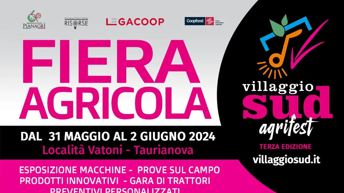 Da venerdì 31 maggio a domenica 2 giugno torna, all’interno del Villaggio Sud Agrifest –Festival della Cooperazione in Località Vatoni di Taurianova, quest’anno Capitale del Libro 2024, la FIERA AGRICOLA più grande dell’intera regione (ad ingresso gratuito) con un’area coperta di oltre 4mila mq dedicata alla esposizione delle imprese agricole e dell’acquacoltura, ma punto di riferimento anche per gli ordini professionali, le università e gli istituti scolastici del territorio, brand, istituzioni ed enti che si rispecchiano nei valori dell’evento che, con il suo approccio olistico, contribuisce a promuovere lo sviluppo sostenibile e la cooperazione tra le varie realtà del territorio.