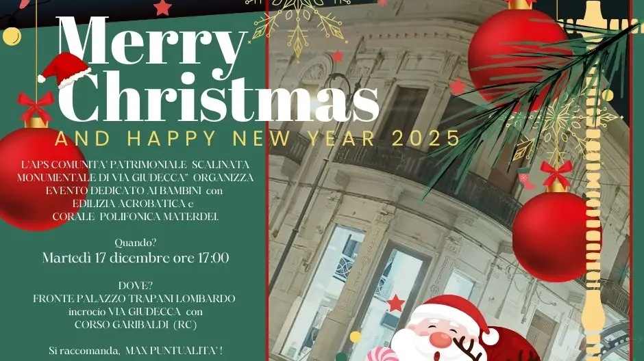 Anche quest’anno Babbo Natale arriverà dall’alto in via Giudecca. Anzi saranno ben 8 i “babbi” Natale che si caleranno da palazzo Trapani Lombardo per consegnare i doni ai bambini. L’appuntamento è domani alle 17:00 con l’evento organizzato dalla Comunità Patrimoniale di via Giudecca, in collaborazione con Edilizia Acrobatica e Corale Polifonica Mater Dei.