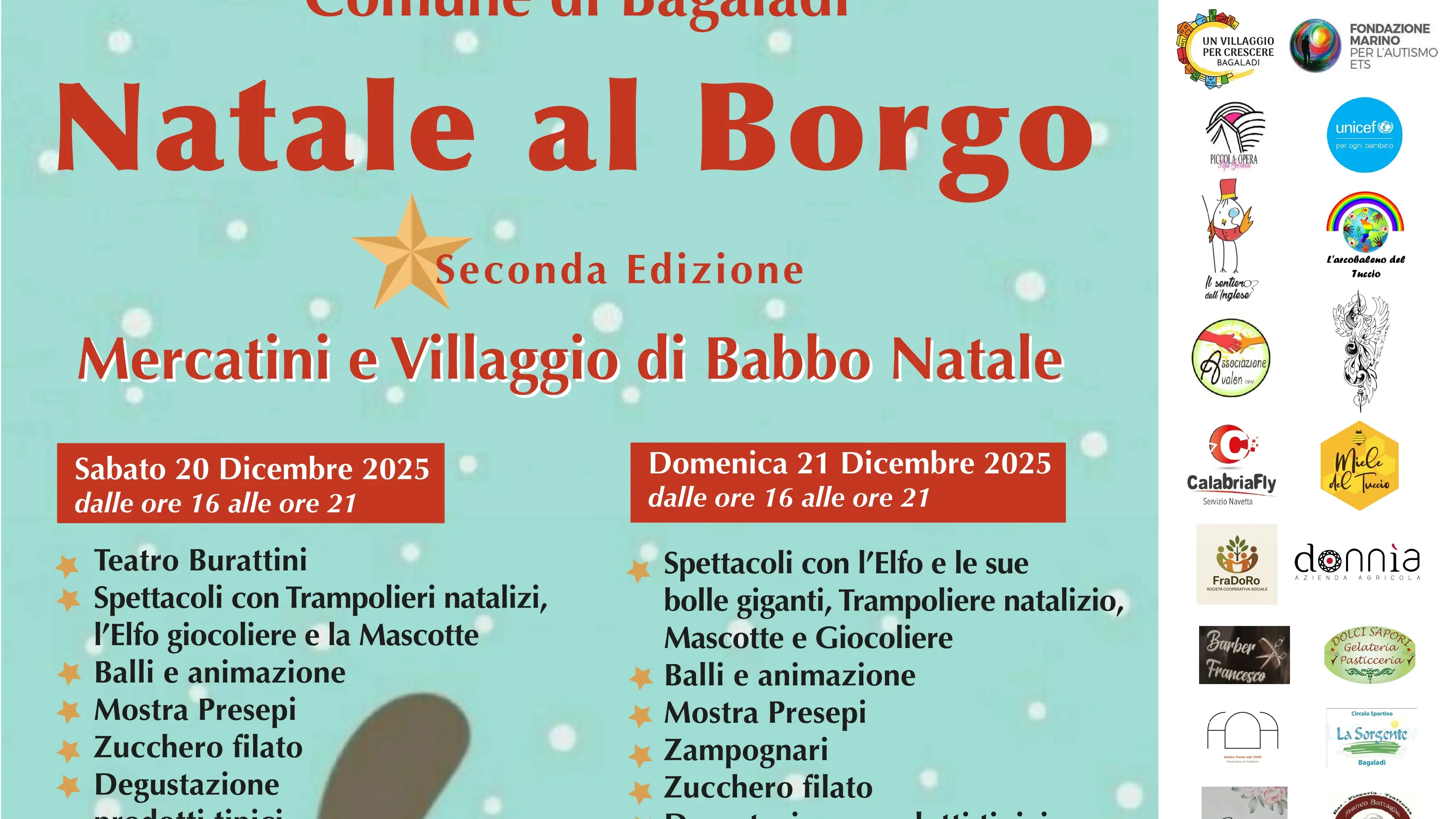 A Bagaladi il 20 e 21 dicembre dalle 16 alle 21 vi aspettano tante delizie gastronomiche, manufatti artigianali, attrazioni, musica, balli e la casa di Babbo Natale addobbata a festa con i suoi Elfi.