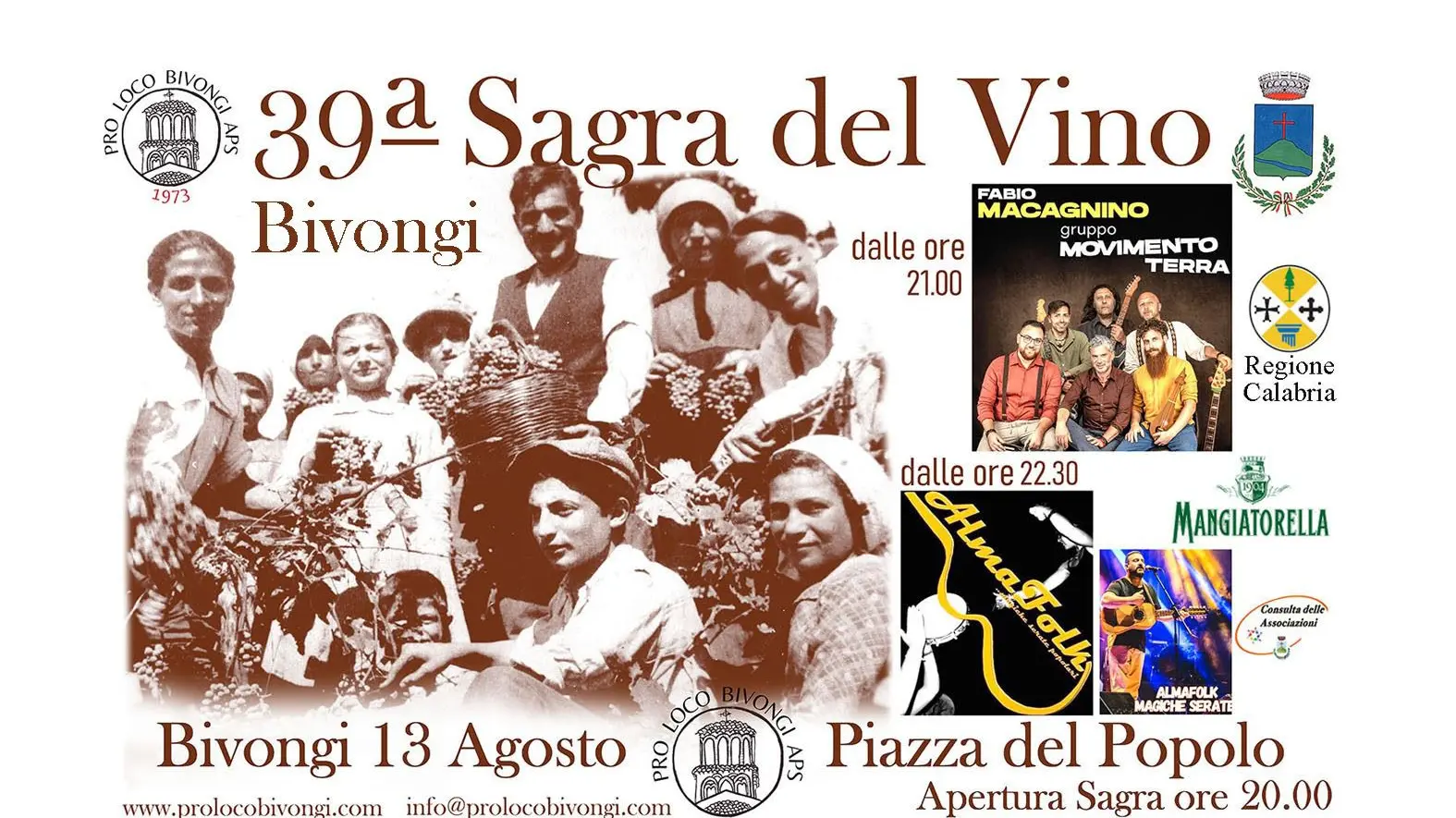 A Bivongi, mercoledì 13 agosto, torna l’appuntamento imperdibile con la 39ª edizione della Sagra del Vino, promossa e organizzata dalla Pro Loco APS, con il patrocinio dell’amministrazione comunale e della Regione Calabria, in collaborazione con Mangiatorella e Consulta delle associazioni.