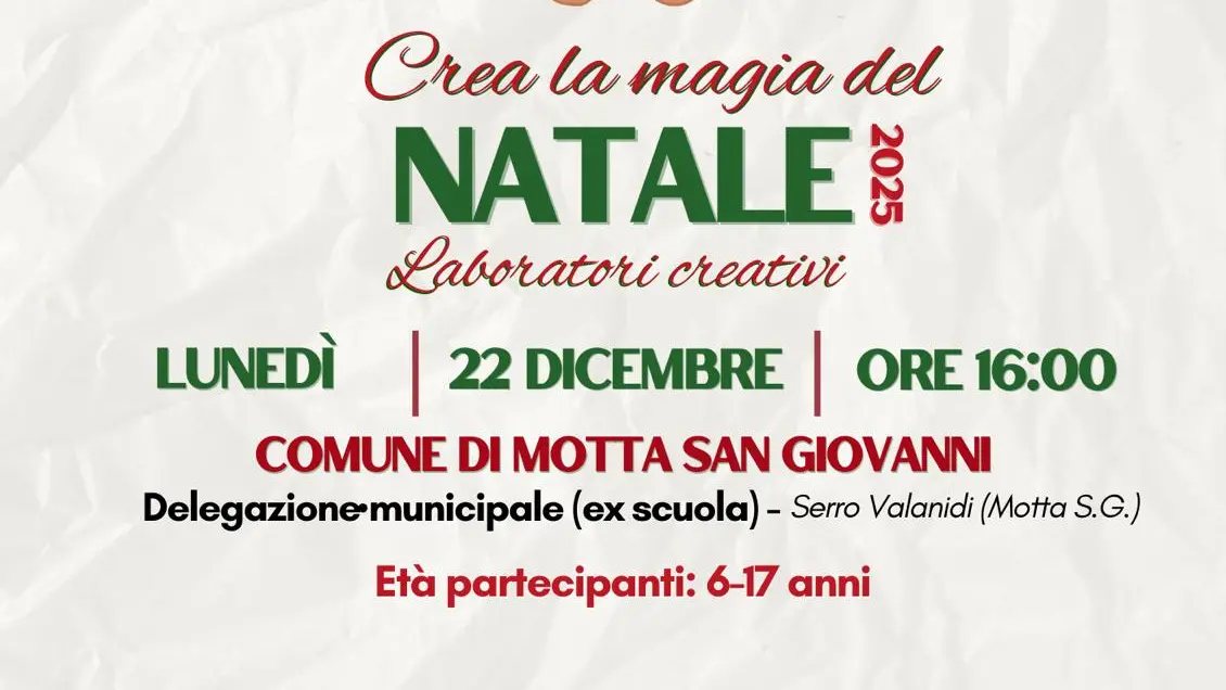 Il Comune di Motta San Giovanni e l’Ambito Territoriale Sociale N.4- Capofila Melito di Porto Salvo, in collaborazione con gli operatori del Progetto P.I.P.P.I. e l’associazione Virtus San Paolo, invitano grandi e piccini a partecipare al laboratorio creativo natalizio in programma a Serro Valanidi.