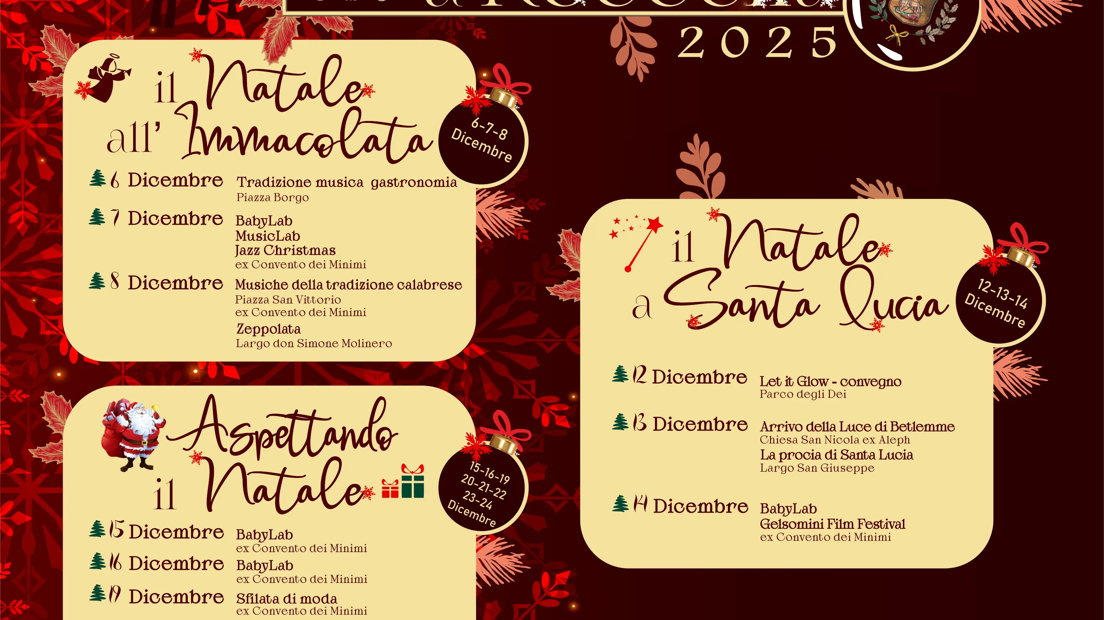 Il secondo blocco, “Natale a Santa Lucia”, si terrà il 12, 13 e 14 dicembre e includerà il convegno “Let It Glow” al Parco degli Dei, l’arrivo delle luci di Betlemme nella Chiesa di San Nicola ex Aleph, la “procìa” di Santa Lucia a Largo San Giuseppe e il Gelsomini Film Festival all’ex Convento dei Minimi.