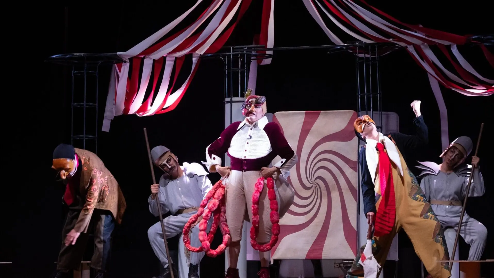 La rivisitazione inedita della commedia, prodotta da Bottega del Pane Teatro, affidata alla regia di Cinzia Maccagnano, sceglie un taglio surreale e una comicità marcata: le situazioni, i ritmi serrati dei dialoghi, il gioco precisissimo del movimento dei personaggi/attori, con e senza maschera; e un coro di cavalieri-fantocci di un circo sgangherato, rivelano una società (e un’umanità) passata e presente, appesa a dei fili sottili, rappresentando gli scontri e tutti i livelli di demagogia che l’autore vuole “smascherare” nella sua commedia.
