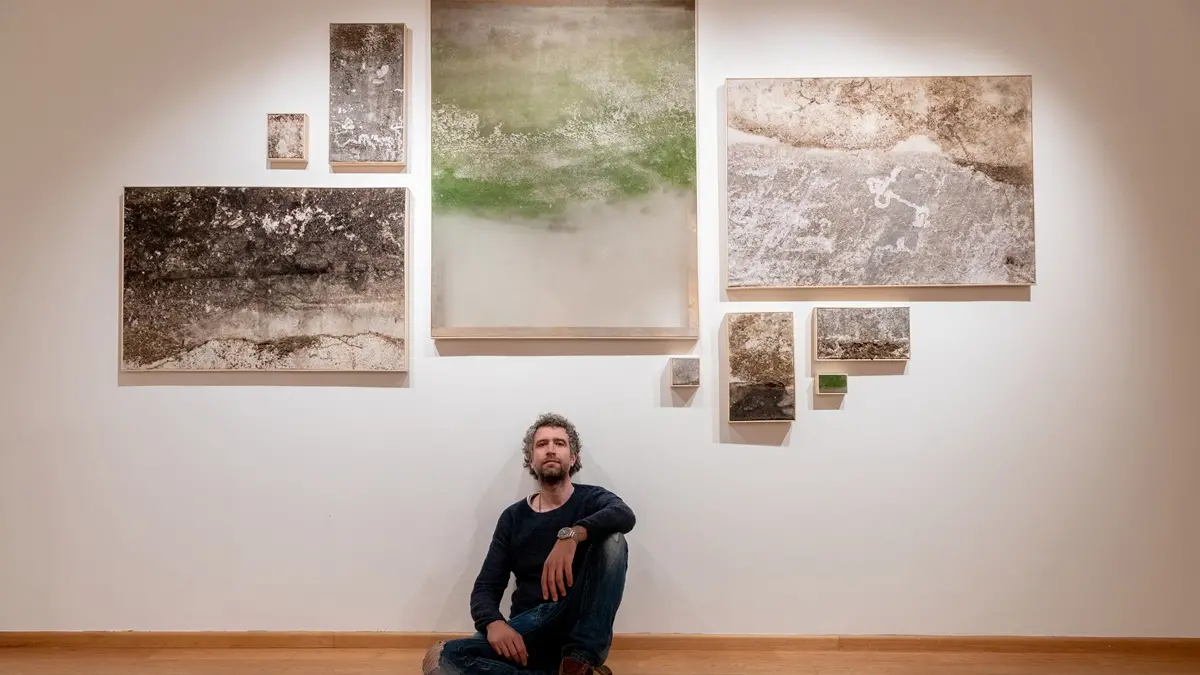 Roberto Ghezzi (Cortona,1978) vanta un curriculum punteggiato da residenze e progetti internazionali, tra i più noti quelli portati avanti in Groenlandia, in Macedonia e ha recentemente esposto presso il Fondaco dei Tedeschi a Venezia. Quasi come un naturale prosieguo della storia della pittura di paesaggio e al contempo sua estrema evoluzione, Ghezzi nelle sue “naturografie” lascia che sia il territorio a manifestarsi sulle tele. Il processo creativo, parte fondante dell’opere di Ghezzi, prevede l’immersione in un ambiente naturale, ghiaccio, foreste, oasi protette, fiumi, laghi e mare, di teleri monumentali che restano in balia dell’imprevedibilità della natura per un tempo stabilito, ponendosi in ascolto verso tutto ciò che la natura pittoricamente ha da dire. Non bisogna dimenticare la provenienza dell’artista, figlio di un pittore, con un nonno scultore, cresciuto nella natura, a pochi passi da Città di Castello e non è un caso se nel processo in divenire dei sudari di Ghezzi ritroviamo grumi di materia, ossidazioni, abrasioni, cretti che ospitano sfumature irripetibili e vive impresse nella matrice che accoglie e raccoglie, mappa e classifica il mutamento delle condizioni nel tempo. Una forte origine concettuale e scientifica permette di rivelare la salute e le condizioni dell’ecosistema che la matrice documenta attraverso la conclusiva sindone dipinta dalla natura con segni tipici dell’arte informale. Anche l’allestimento svolge un ruolo significativo: drappi