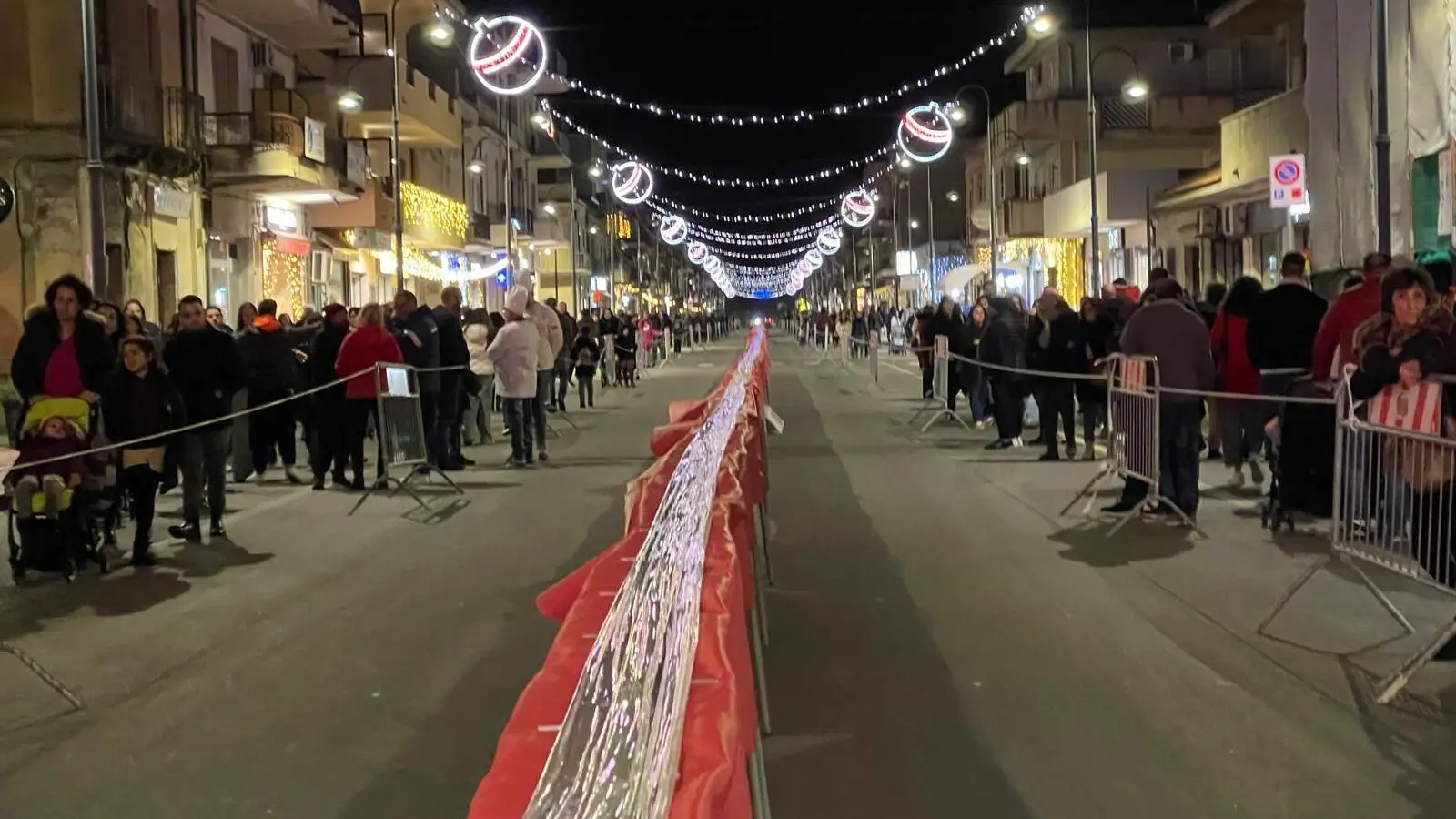 Circa 530 metri di pura bontà. E’ il nuovo primato conquistato dai maestri pasticceri di Marina di Gioiosa Jonica, che dopo 10 anni sono tornati all’opera per preparare il torrone da record, assemblato lungo il centralissimo corso Carlo Maria e distribuito gratuitamente al numeroso pubblico presente in segno di augurio per le festività natalizie.