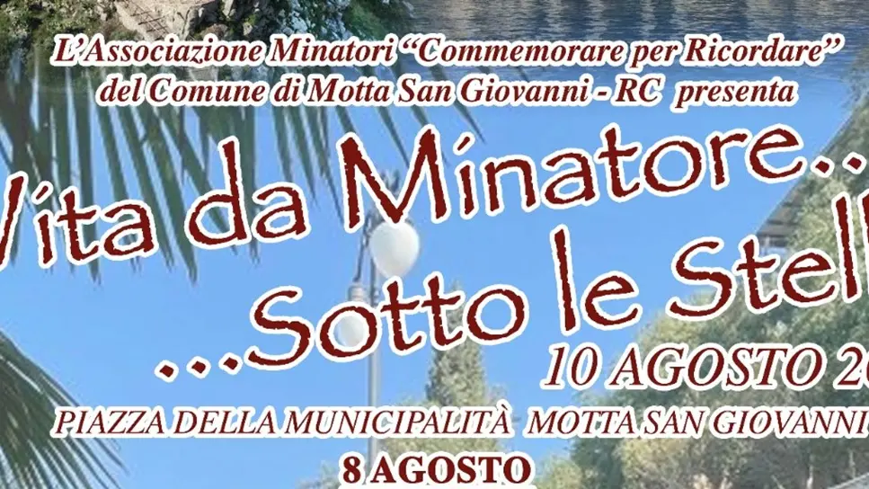 L’associazione dei minatori del Comune di Motta San Giovanni annuncia che il prossimo 10 agosto si terrà in Piazza della Municipalità di Motta San Giovanni, la 6° edizione della manifestazione “Vita da Minatore” col tema “Il Percorso del Pane”. Il motto della nostra associazione è: “Commemorare per Ricordare” l’organizzazione del suddetto evento vuole essere un modo per rendere vive e presenti nella memoria della comunità mottese e non solo questa espressione.