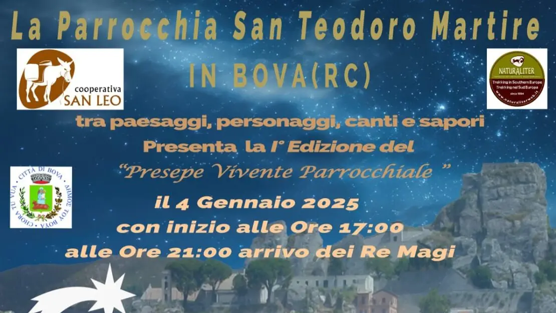 Una piccola Betlemme nella città antica di Bova, paese gioiello e tra i borghi piu belli d’Italia. La Parrocchia San Teodoro Martire guidata ed animata dal Sac. Mons. Can. Leone Stelitano, con il patrocinio del Comune e insieme alla comunità tutta è pronta ad accogliere residenti e visitatori nel suggestivo scenario delle vie dell’antico borgo, dove sabato 4 gennaio, alle ore 17 e con conclusione prevista per le ore 21 con l’arrivo dei Magi, verrà allestito il Presepe Vivente.
