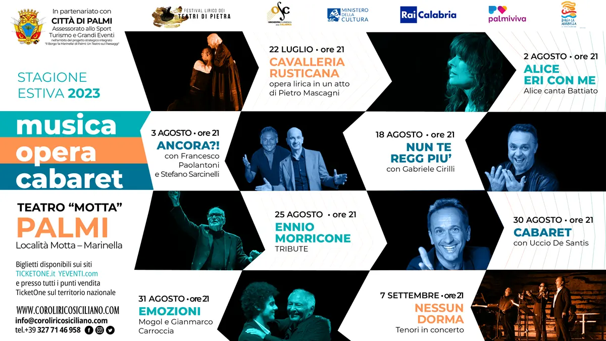 Per la prima volta il meraviglioso Teatro della città di Palmi, che si erge in uno scenario naturale tra l’azzurro del mare, il verde dei fianchi del Sant’Elia e le chiome argentate degli uliveti secolari, ospiterà una prestigiosa Stagione che spazia dalla grande opera, al sinfonismo, al cabaret e alla musica d’autore di qualità firmata Coro Lirico Siciliano per il Festival Lirico dei Teatri di Pietra.
