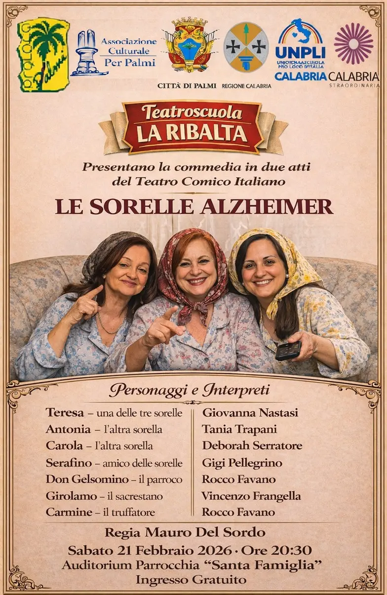 Nell’ambito della 42ª Ottava di Carnevale della Piana, la città di Palmi si prepara ad accogliere una serata di teatro capace di unire comicità, profondità e attenzione ai temi sociali. Le associazioni Pro Loco Palmi, Associazione Culturale “Per Palmi” e Teatroscuola La Ribalta presentano la commedia in due atti del Teatro Comico Italiano “Le Sorelle Alzheimer”, con il patrocinio del Comune di Palmi, della Regione Calabria, di UNPLI Calabria e del brand Calabria Straordinaria.