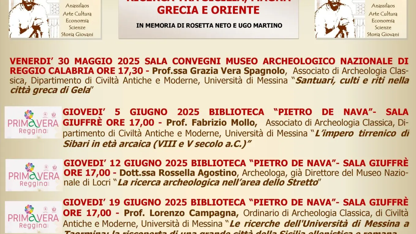 Gli incontri Patrocinati del Comune di Reggio Calabria nell’ambito della Primavera Reggina, dal Dipartimento di Civiltà Antiche e Moderne dell’Università di Messina, dalla Sezione Ibico Reggio Calabria dell’Associazione italiana di Cultura Classica (AICC) e dal Liceo Classico “Tommaso Campanella di Reggio Calabria fondamentale corso di studi per mantenere viva la conoscenza dell’Antico tra le più giovani generazioni di studenti e allievi sono dedicati alla memoria di due illustri docenti di questo medesimo Liceo (Rosetta Neto e Ugo Martino) che hanno trasmesso a generazioni di allievi i valori dell’Antico.
