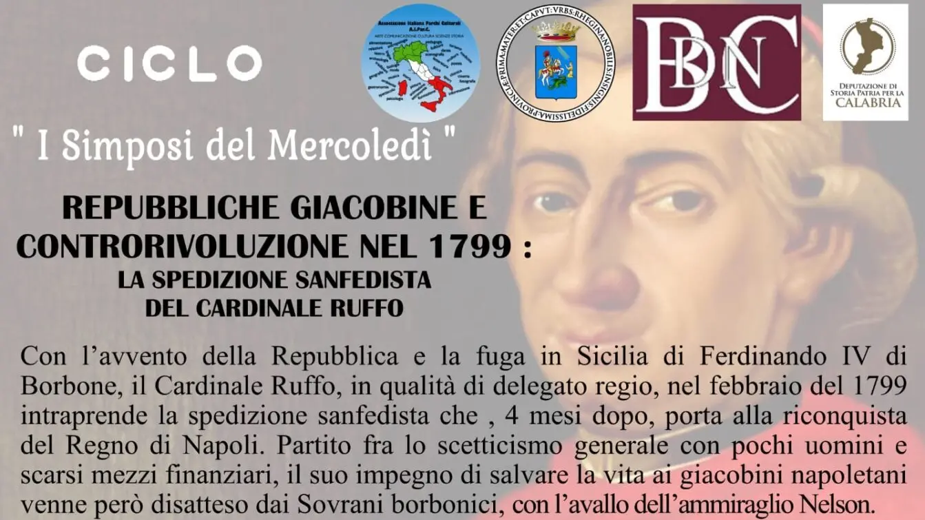 Con l’avvento della Repubblica e la fuga in Sicilia di Ferdinando IV di Borbone, il Cardinale Ruffo, in qualità di delegato regio, nel febbraio del 1799 intraprese la spedizione sanfedista che 4 mesi dopo portò alla riconquista del Regno di Napoli. Partito fra lo scetticismo generale con pochi uomini e scarsi mezzi finanziari, il suo impegno di salvare la vita ai giacobini napoletani venne però disatteso dai Sovrani borbonici, con l’avallo dell’ammiraglio Nelson.I saluti istituzionali saranno affidati all’ Avv. Giuseppe Falcomatà Sindaco della Città di Reggio Calabria, alla Dott.ssa Daniela Neri, Responsabile della Biblioteca Pietro De Nava, al Dott. Salvatore Timpano Presidente nazionale A.I.Par.C.e al Prof. Giuseppe Caridi, Presidente della Deputazione di Storia Patria per la Calabria