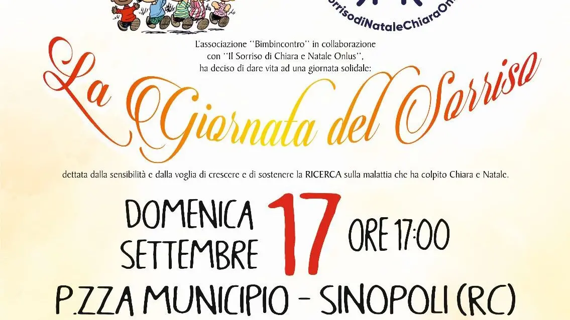 L’associazione “Ilsorriso di Natala e Chiara” invita tutti il 17 settembre in Piazza Municipio a Sinopoli dalle ore 17:00. «I motivi che spingono l’associazione a non fermarsi e continuare a realizzare eventi benefici sono: Ricerca, sostentamento delle cure e prevenzione. Quest’evento benefico è nato dalla forza, quella forza trasmessa da Natale e Chiara nella quotidianità e da quel sorriso, sorriso che non è mai scomparso dal loro viso, nonostante le sfide che la vita gli ha messo davanti. Lo scopo di questa giornata, intitolata, “La giornata del Sorriso” è quello di strappare un sorriso a mamme, nonne, zii e parenti, far divertire i nostri bambini e mettere tutti, dai più grandi ai più piccoli, a contatto col mondo della disabilità e della solidarietà, un mondo dove si viene ripagati con un semplice sorriso. Perché il sorriso di un bambino rende vivi».
