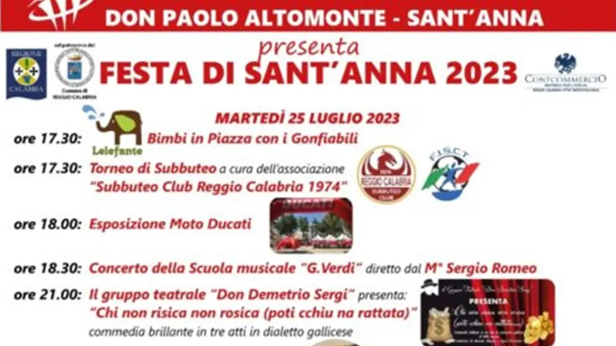 E quest’anno? L’associazione continua a stupire in un crescendo di qualità…Il 25 luglio lo spettacolo inizia con i Bimbi in Piazza ed i gonfiabili, il Torneo di Subbuteo, l’esposizione delle moto Ducati; continua con l’esibizione artistica dei ragazzi della Scuola di Musica G Verdi, poi il Teatro con una pièce comica in dialetto reggino. Conclude la serata la performance artistica di Alfredo Auspici ed i “Mal i Skin” con lo spettacolo “Dio salvi la Reggina”.