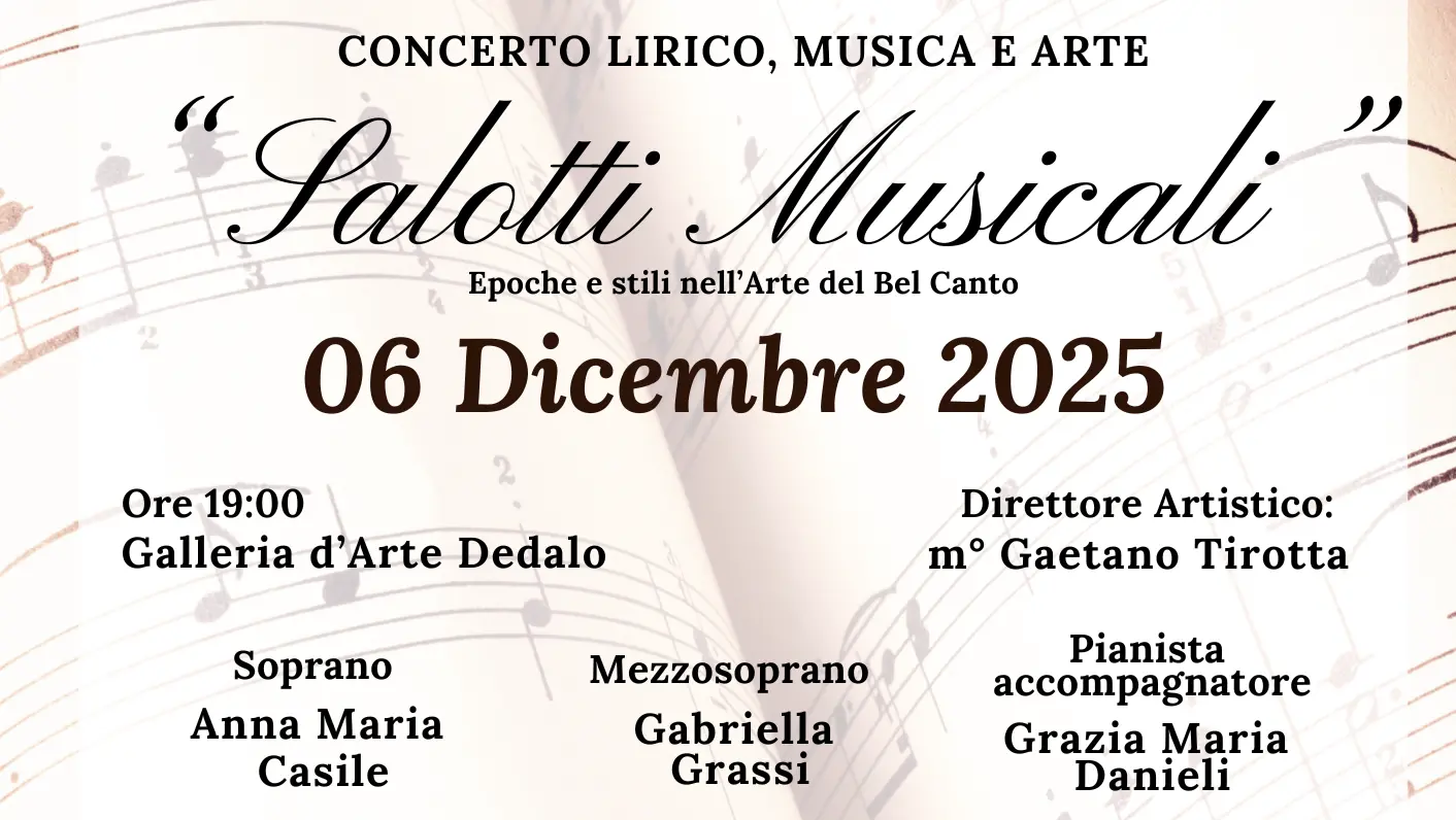 Il 6 dicembre 2025, alle ore 19:00, la Galleria d’Arte Dedalo ospiterà il 2° concerto del ciclo “Salotti Musicali”, a cura del Nuovo Laboratorio Lirico diretto dal M° Gaetano Tirotta.
