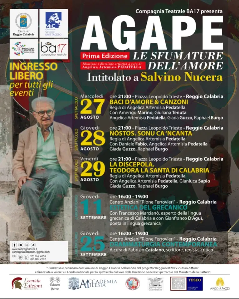 Gli appuntamentiIl festival si apre il 27 agosto alle ore 21.00 presso l’anfiteatro posto in piazza Leopoldo Trieste con lo spettacolo “BACI D’AMORE & CANZONI” con la presenza del tenore di ritorno dal tour in Cina Amerigo Marino e con la soprano Giuliana Tenuta; continua il 28 agosto alle ore 21.00 presso lo stesso anfiteatro in piazza Leopoldo Trieste con l’opera di teatro-concerto “NÓSTOS. SONU CA ‘NCANTA” con le performance vocali e sonore di Daniele Fabio, celebre chitarrista e compositore che ha recentemente riscosso un notevole successo anche in Inghilterra, e con le acrobazie dei danzatori contemporanei Giada Guzzo e Raphael Burgo; la triade di spettacoli si conclude il 29 agosto alle ore 21.00 ancora presso l’anfiteatro in piazza Leopoldo Trieste con lo spettacolo “LA DISCEPOLA. TEODORA LA SANTA DI CALABRIA” con Gianluca Sapio e Angelica Artemisia Pedatella, alla scoperta del volto dell’unica santa donna di Calabria e dell’affascinante mondo bizantino, ultimo baluardo mediterraneo della grecità. Il festival continua a settembre con due laboratori essenziali che si svolgeranno entrambi presso il Centro Anziani “Rione Ferrovieri” alle ore 16.00: il primo appuntamento è fissato per l’11 settembre con “ESTETICA DEL GRECANICO” con il docente di lingua grecanica Francesco Marcianò, con il poeta Gianfranco D’Aguì i cui versi in grecanico stanno conquistando platee nuove che scoprono la magia di questa lingua, e con la regista Angelica Artemisia Pedatella, che ha portato in scena l’opera sull’Iliade con le traduzioni del compianto poeta Salvino Nucera; il secondo appuntamento è fissato per il 25 settembre con “DRAMMATURGIA CONTEMPORANEA” sulle nuove connessioni tra teatro e intelligenza artificiale a cura di Fabrizio Catalano, regista, intellettuale, scrittore, nipote del grande Leonardo Sciascia e suo erede culturale. Tutti gli eventi di questa prima edizione sono GRATUITI. Informazioni presso le pagine social della Compagnia Teatrale BA17 e al numero whatsapp indicato in locandina.