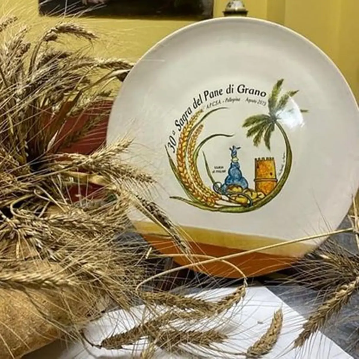 Il logo scelto quest’anno per il piatto in ceramica raffigura le spighe e la Varia. Una sorta di “abbraccio ideale” tra Bagnara e Palmi volutamente cercato dagli artisti artigiani.