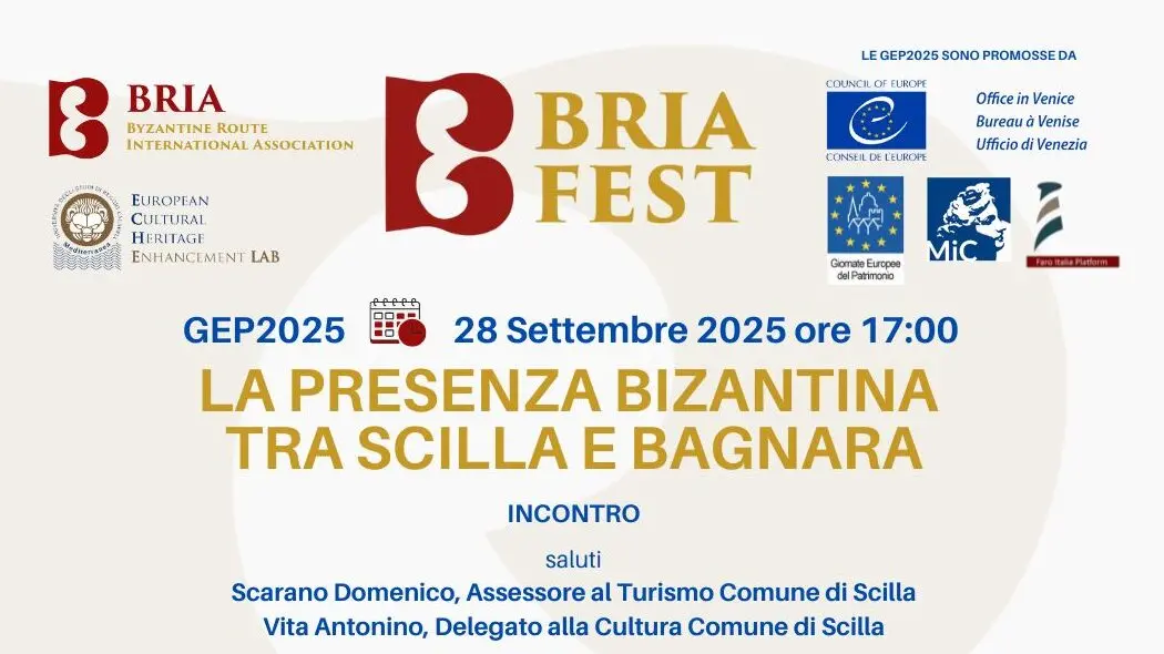 Nell’ambito della prima edizione del BRIA FEST – nel corso del quale saranno messi in rete 36 siti culturali, italiani e internazionali, attraverso un programma articolato di iniziative gratuite (visite guidate, mostre, passeggiate culturali e altre attività) – domenica 28 settembre 2025 alle ore 17:00 presso il Castello Ruffo di Scilla, si terrà l’incontro “La presenza bizantina tra Scilla e Bagnara”, promosso in occasione delle Giornate Europee del Patrimonio 2025 e inserito nell’itinerario europeo “Paesaggio culturale bizantino del Mediterraneo” della Byzantine Route International Association (BRIA).