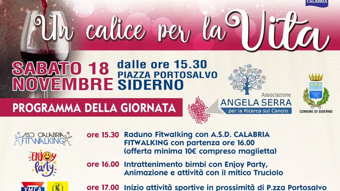 Al via “Un calice per la vita”, evento di sensibilizzazione e solidarietà dedicato alla prevenzione dei tumori maschili promosso e organizzato dall’Associazione “Angela Serra” – sezione Locride, con il patrocinio del Comune di Siderno e della Regione Calabria, che si svolgerà sabato 18 novembre 2023, a partire dalle 15.30, in Piazza Portosalvo.