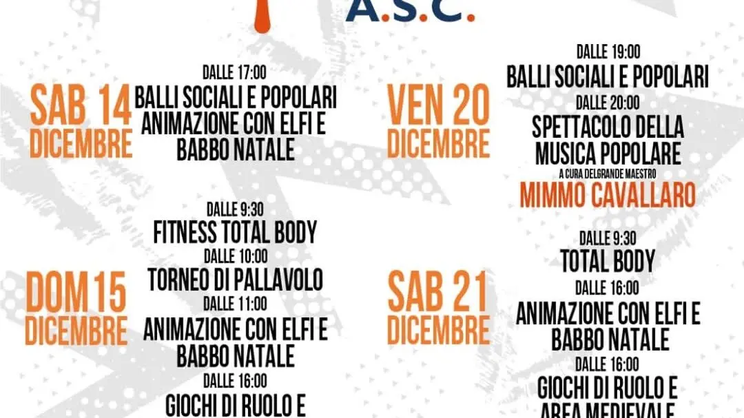 Anche questa volta un ricco programma di attività ed eventi no-stop tra social dance, danza, benessere, sport di squadra, Musiche Popolari, ELFI ed intrattenimento di vario genere per allietare tutti, con inizio venerdì dalle 18:00 con i balli sociali e, soprattutto, con lo spettacolo di musica popolare a cura dell’artista di fama indiscussa e grande maestro Mimmo Cavallaro che concluderà la prima giornata del doppio appuntamento Vivi Sbarre ASC. Invece, sabato 21 dicembre dalle 9:30 in poi avremo un susseguirsi di diverse attività tra animazione, tornei, giochi e fitness, che allieteranno il Rione Marconi sino a tarda serata.
