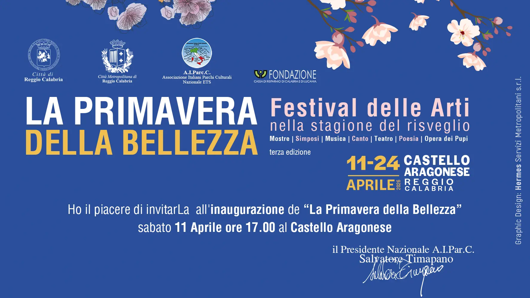 “La Primavera della Bellezza” è un festival delle arti nella stagione del risveglio, ideato e promosso da AIParC Nazionale e dal suo presidente Salvatore Timpano, in partenariato con il Comune di Reggio Calabria, con il contributo della Fondazione Carical e il patrocinio morale della Città Metropolitana, in collaborazione con numerosi enti, istituzioni e associazioni del territorio.