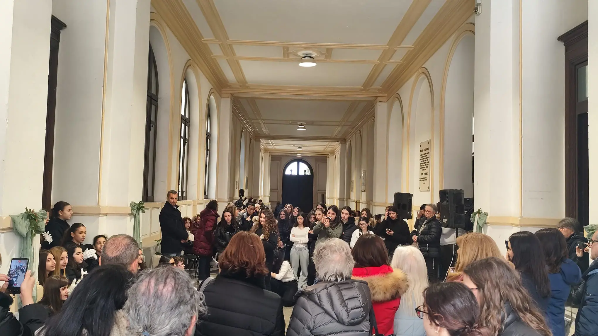 A causa delle condizioni meteorologiche avverse l’appuntamento, previsto inizialmente a Piazza Italia, si è svolto all’interno della Galleria di Palazzo San Giorgio, dove si è registrata una significativa partecipazione di cittadinanza e studenti delle varie scuole coinvolte.