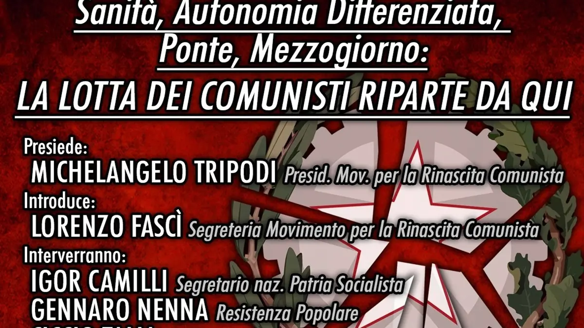 Della “Quistione Meridionale” (come direbbe Antonio Gramsci), si parlerà, dunque, nel suo insieme, a Reggio Calabria, il prossimo 7 dicembre, presso lo Spazio Open, in via Filippini 25, dalle ore 17.00, con Michelangelo Tripodi, Presidente nazionale del MpRC, e già Assessore Regionale in Calabria; Lorenzo Fascì, avvocato e membro della Segreteria nazionale del MpRC; Igor Camilli, Segretario nazionale di Patria Socialista; Gennaro Nenna, di Resistenza Popolare; Ciccio Talia, di Costituente Comunista, con le conclusioni di Fosco Giannini, Coordinatore nazionale del MpRC.
