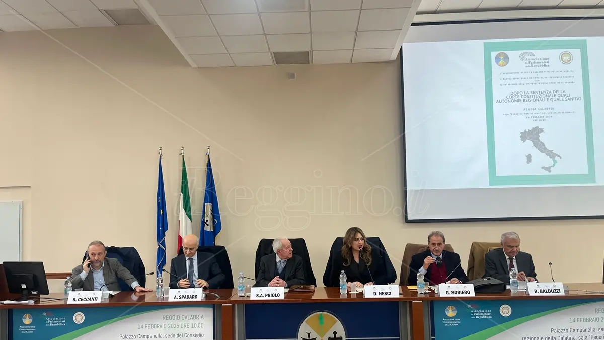 Dunque la riflessione dovrà essere rinnovata con diversi punti di partenza a delineare i quali si propone di contribuire l’odierna giornata di studio promossa dall’associazione degli Ex Parlamentari della Repubblica Italiana, presieduta da Giuseppe Gargani, e dall’associazione degli ex Consiglieri Regionale della Calabria, presieduta da Stefano Arturo Priolo, con il patrocinio dell’università Mediterranea di Reggio Calabria. L’iniziativa, svoltasi nella sala Federica Monteleone di palazzo Campanella a Reggio Calabria, è stata moderata da Dalila Nesci, già sottosegretaria di Stato per il Sud. Si è pregiata degli autorevoli interventi, tra gli altri, di Renato Balduzzi, docente dell’università Cattolica di Milano, presidente dell’Associazione Italiana dei Costituzionalisti e già Ministro della Salute, Stefano Ceccanti, docente dell’università La Sapienza di Roma, e Antonino Spadaro, docente dell’università Mediterranea di Reggio Calabria.
