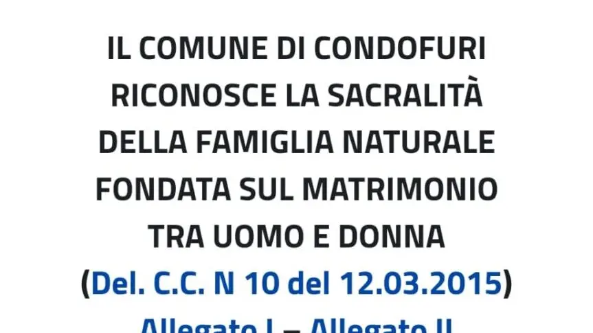 «Il comune di Condofuri riconosce la sacralità della famiglia naturale fondata sul matrimonio tra uomo e donna». Questa era la frase che, da più di tre anni, campeggiava centrale nella home page del sito istituzionale del comune di Condofuri. Una scelta ed una disposizione ben precisa partita illo tempore dal consigliere comunale di minoranza – nel 2015 – poi diventato sindaco, l’uscente Tommaso Iaria.