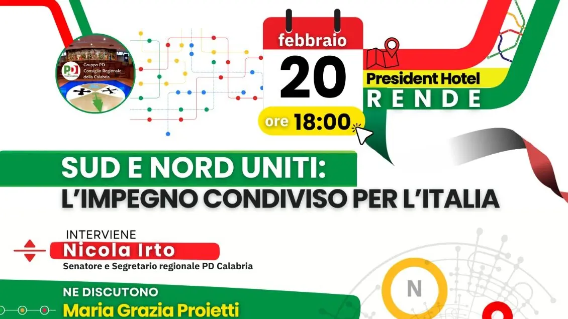 Il 20 febbraio 2025, alle 18:00, al President Hotel di Rende, si terrà un incontro organizzato dal gruppo del Pd in Consiglio regionale della Calabria dal titolo: “Sud e Nord Uniti: l’impegno condiviso per l’Italia”. Un’occasione di confronto fondamentale per discutere il futuro del nostro Paese e la necessità di rafforzare la collaborazione tra Nord e Sud, uniti per superare le disuguaglianze e promuovere lo sviluppo equo di tutte le Regioni.