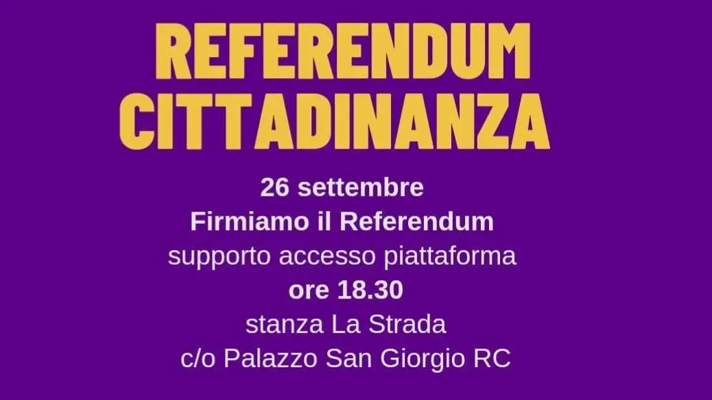 Nell’ambito delle iniziative di “ritorno alla Politica” promosse dal movimento La Strada, vi diamo appuntamento giovedì 26 settembre alle ore 18:30 a Palazzo San Giorgio (stanza del gruppo consiliare La Strada) per un incontro di raccolta firme (supporto alla firma SPID) e di informazione rispetto al referendum cittadinanza, realizzato in collaborazione con Calabria Possibile, e che vedrà una diretta instagram animata da rappresentanti de La Strada e di Calabria Possibile e con il collegamento previsto di Francesca Druetti, segretaria di Possibile, e di Giuseppe Civati, saggista ed editore nonché fondatore di Possibile.