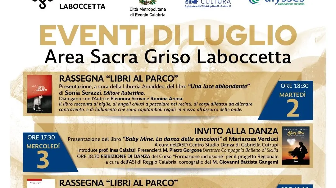 L’attività culturale dell’area archeologica sacra “Griso Laboccetta”, bene della Città Metropolitana gestito dall’associazione Ulysses, continua per tutto il mese di luglio. Diversi gli appuntamenti in programma, a partire da questo pomeriggio (2 luglio) alle 18:30, con la rassegna “Libri al parco” e la presentazione del volume “Una luce abbondante” di Sona Serazzi (ed. Rubettino). Con l’autrice dialogheranno Eleonora Scrivo e Romina Arena. Domani (3 luglio), con inizio alle 17:30, sarà la volta di “Invito alla danza” e l’approfondimento sul testo “Baby Mine.