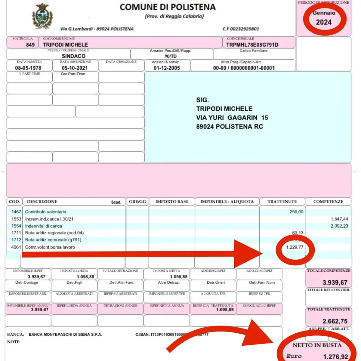 «Io non faccio politica per i soldi, a differenza di altri». Queste le parole con le quali il sindaco di Polistena, Michele Tripodi – stanco delle continue polemiche e delle accuse che gli vengono mosse dai suoi “avversari” politici – ha deciso di accompagnare la pubblicazione della sua busta paga sui social, a dimostrazione del fatto che il suo non è un lavoro ma una passione. «Nei giorni scorsi – ha affermato il primo cittadino – ho assistito, come assisto ormai di frequente, all’ennesima buffonata dei miei denigratori personali, i quali si autoattribuiscono la qualifica di “oppositori politici”.