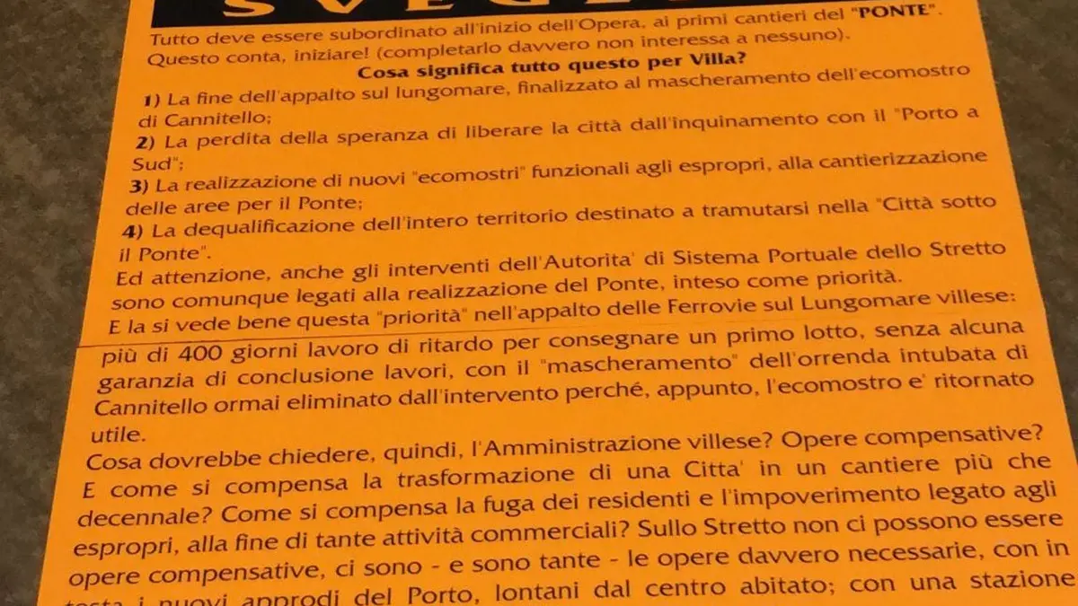 Enzo Musolino, Segretario cittadino del Partito Democratico di Villa San Giovanni, informa in una nota che è stato affisso in città un manifesto del Gruppo Pd: «Vogliamo suonare la “sveglia” per avvertire i cittadini sui danni che il “Ponte” di Salvini e della Lega Nord ha già prodotto in Città».